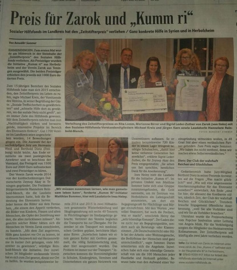 Preis für Zarok und "Kumm ri" Badische Zeitung vom 29.10.2016
